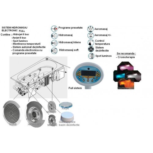 Cada acril, model: Cimbra Ø170cm - Banos10 Finisaj: alb lucios. Material: acril sanitar ranforsat Dimensiuni: Ø170*h68 cm Hidromasaj: sistem FULL - Jeturi hidromasaj laterale 8 buc - Jeturi aeromasaj vertical 16 buc - Panou de comanda multifunctional - Spot luminos - Sistem de mentinerea temperaturii ( posibilitate setare ) - programe de hidromasaj presetate - Senzor detectare nivel apa in cada - Sietem de dezinfectie electronic cu setare manuala - Senzor detectare lichid dezinfectie - Pompa hidromasaj 850w - Compresor aeromasaj 650w (cu aer cald ) - Rezistenta mentinerea temperaturii 1300w - Cadru metalic sustinere cada hidromasaj Se recomanda: Sifon automat cada Cimbra: Pret: 365 lei Masca frontala lemn pentru cada Cimbra culoare : wenge ,gri; Pret: 2890 lei Opinii (0)