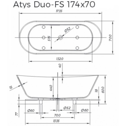 Cada 174x70 model Atys Duo FS - Kolpasan Material : compozit (solid surface) Finisaj : alb lucios /suport black Amplasare : Free - Standing Dimensiuni 1740 x 700 x 600mm Coloana de scurgere cu sifon si preaplin incluse