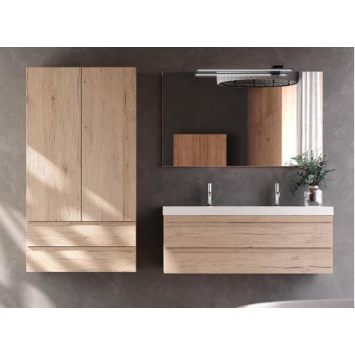 Mobilier pentru baie120 cm, model Naomi- KolpaSan Finisaj: natural wood/ alb/ beton negru Material: - fronturi MDF infoliat - box MDF - lavoar marmura sintetica - manere integrate - feronerie metal + inchidere lenta - iluminare LED; 4,8/ 9,6 w Dimensiuni: - vezi schitele Contine : - baza mobilier finisaj la alegere - lavoar marmura sintetica -oglinda rectangulara 120x70 cm -aplica led 700 Se recomanda : -dulap vertical N1501/DIM: 400X320Xh1495 PRET:1750 LEI -dulap vertical N1501/790 DIM:790X320Xh1495 PRET:2290 LEI Opinii (0)