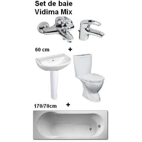 Set de baie Vidima Mix Contine : - cada de baie 170 / 70 CM - lavoar 60 cm cu picior - wc cu rezervor mecanism si capac - baterie de lavoar - baterie de cada cu accesorii